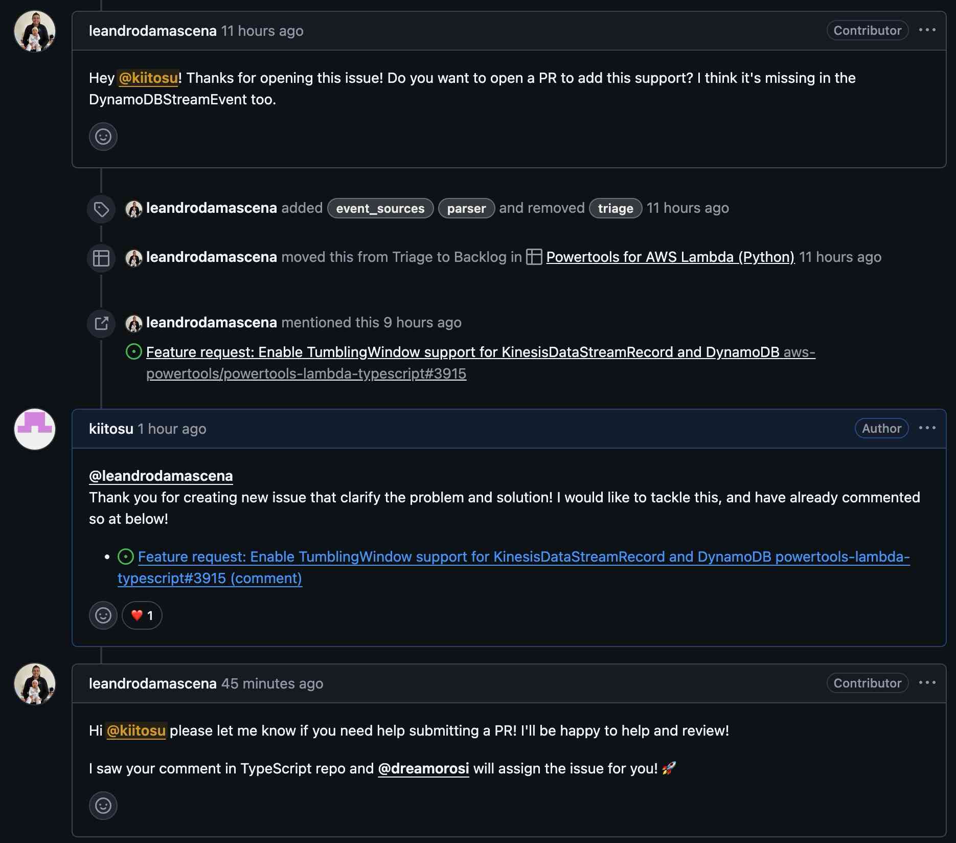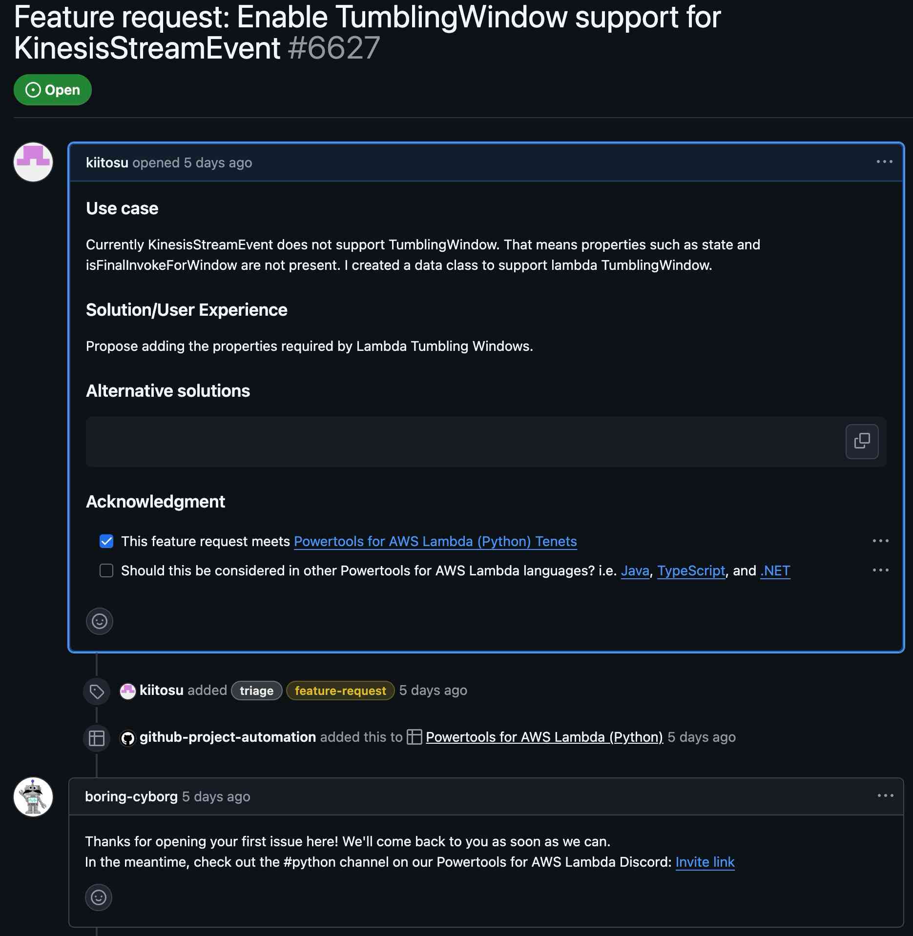 issueを出してから5日後、レスポンスきた! しかも、lambda-powertools-typescript向けにわかりやすいissueを切り直してくれている.