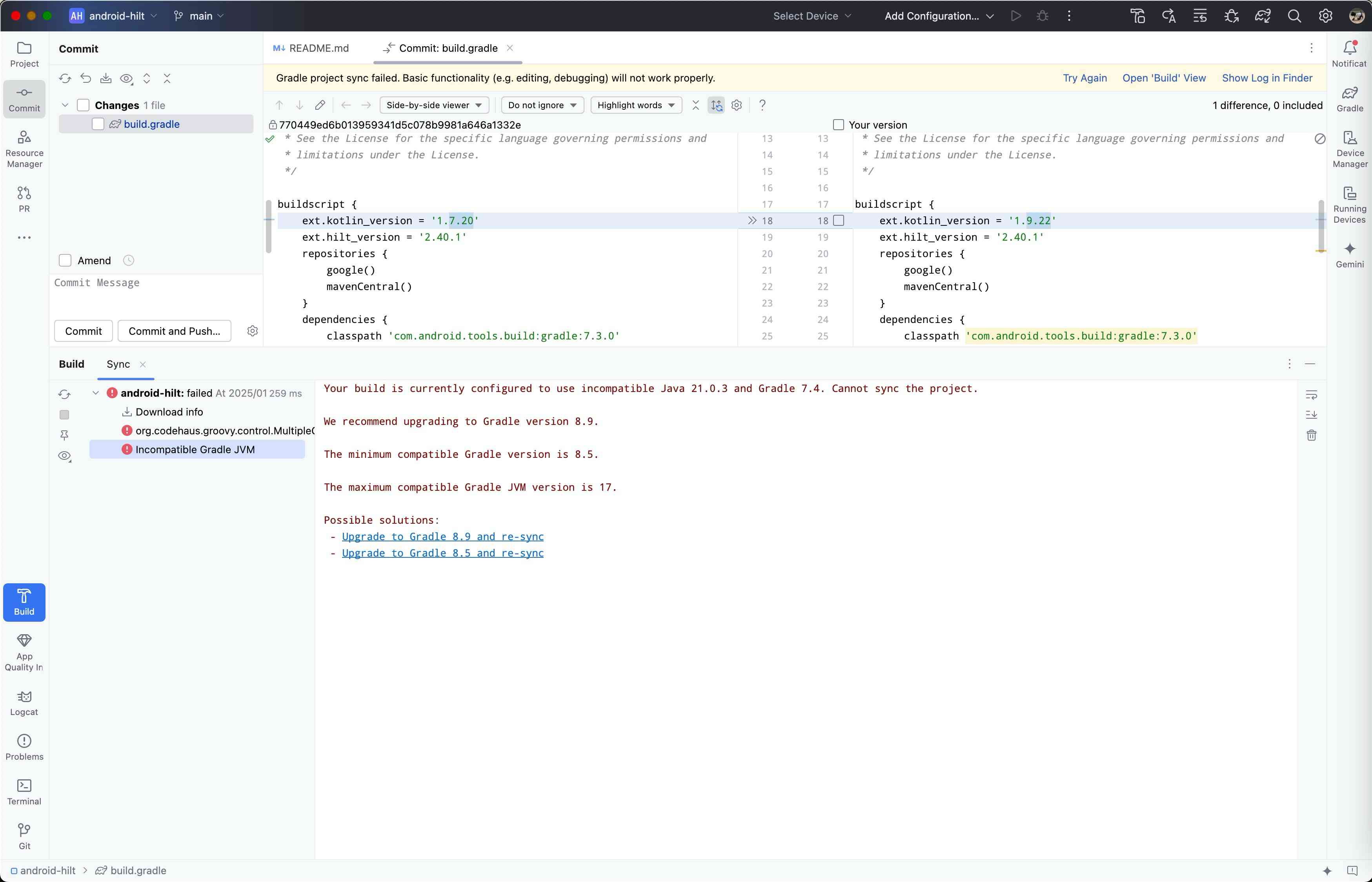 kotlinのversionを1.9.22にすると直るという情報があったので、kotlinコンパイラのバージョンアップを試した。