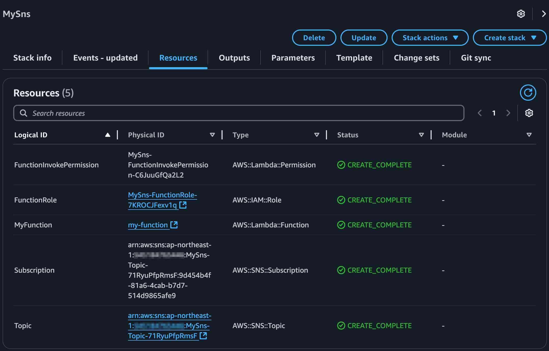 - MySnsスタックのFunctionInvokePermission -> MyLambdaSubscription->FunctionInvokePermission