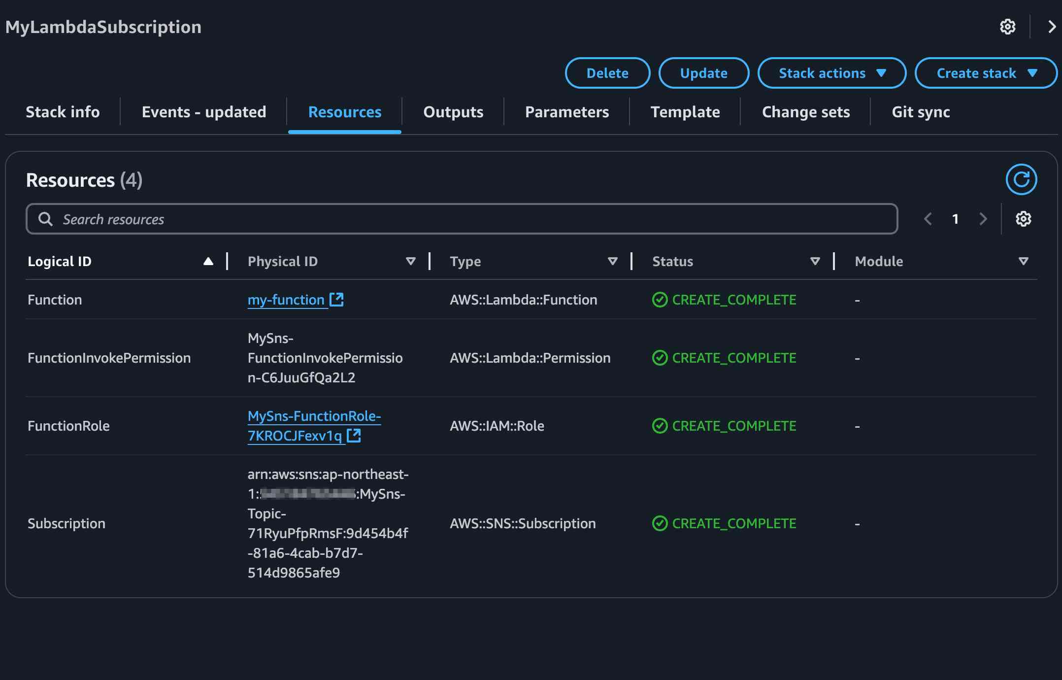 つまりここでは、MySnsスタックのMyFunctionリソースとMyLambdaSubscriptionスタックのFunctionリソースは同じものですよ。ということですね。