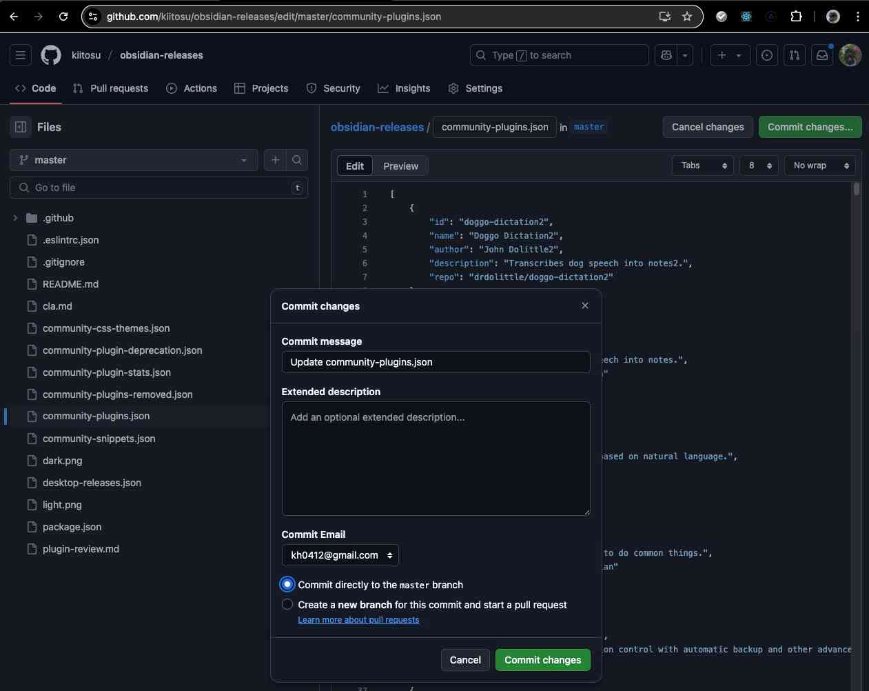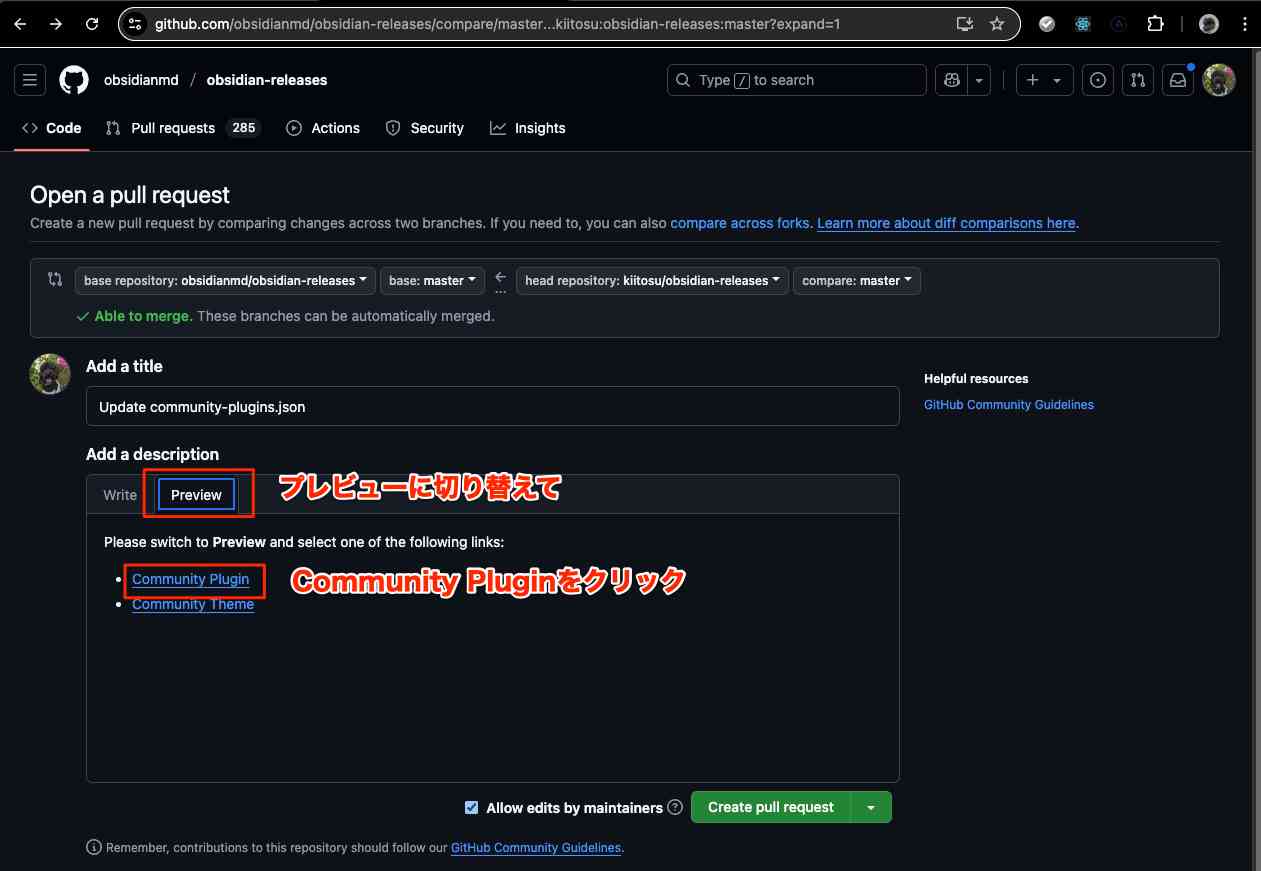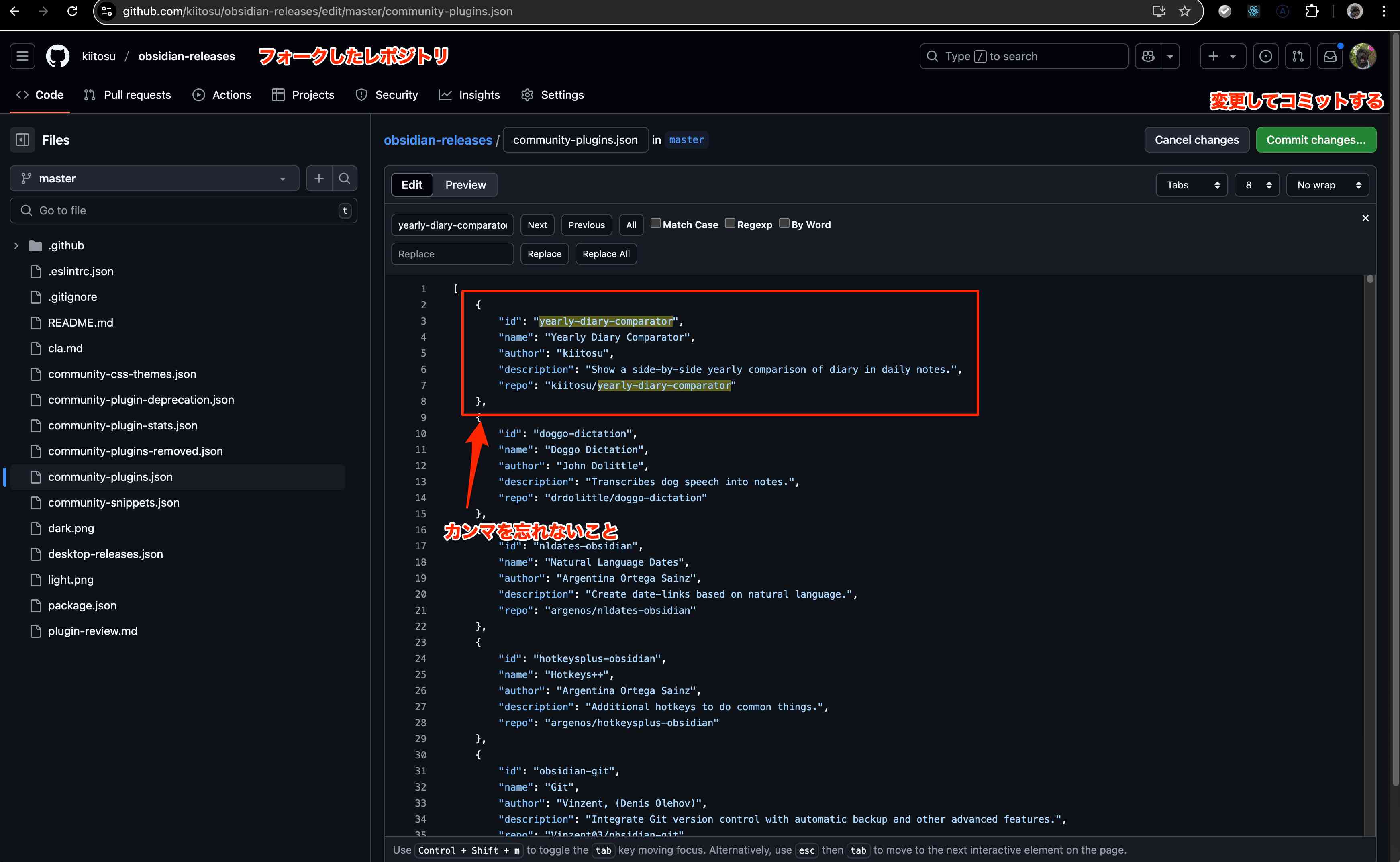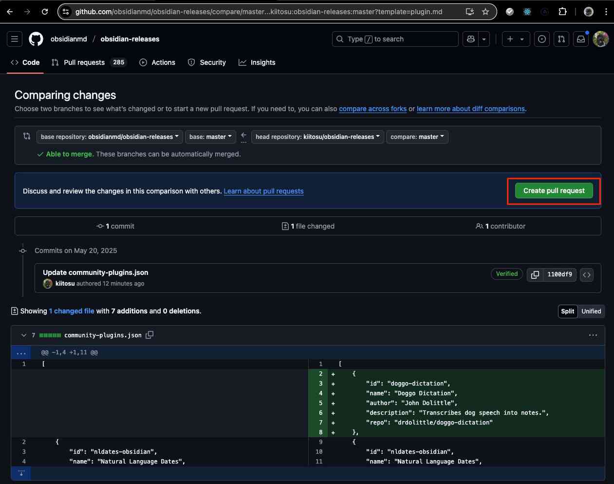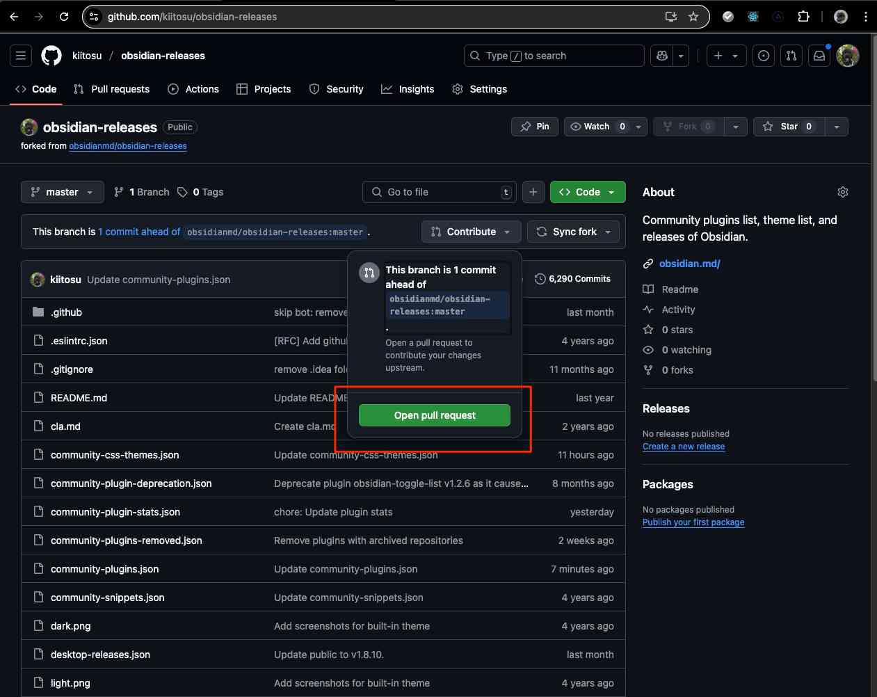 :::message ここまでが自分が開発したレポジトリでの作業になります。 以降はobsidian-releaseでのブラウザ上の作業になります。 :::