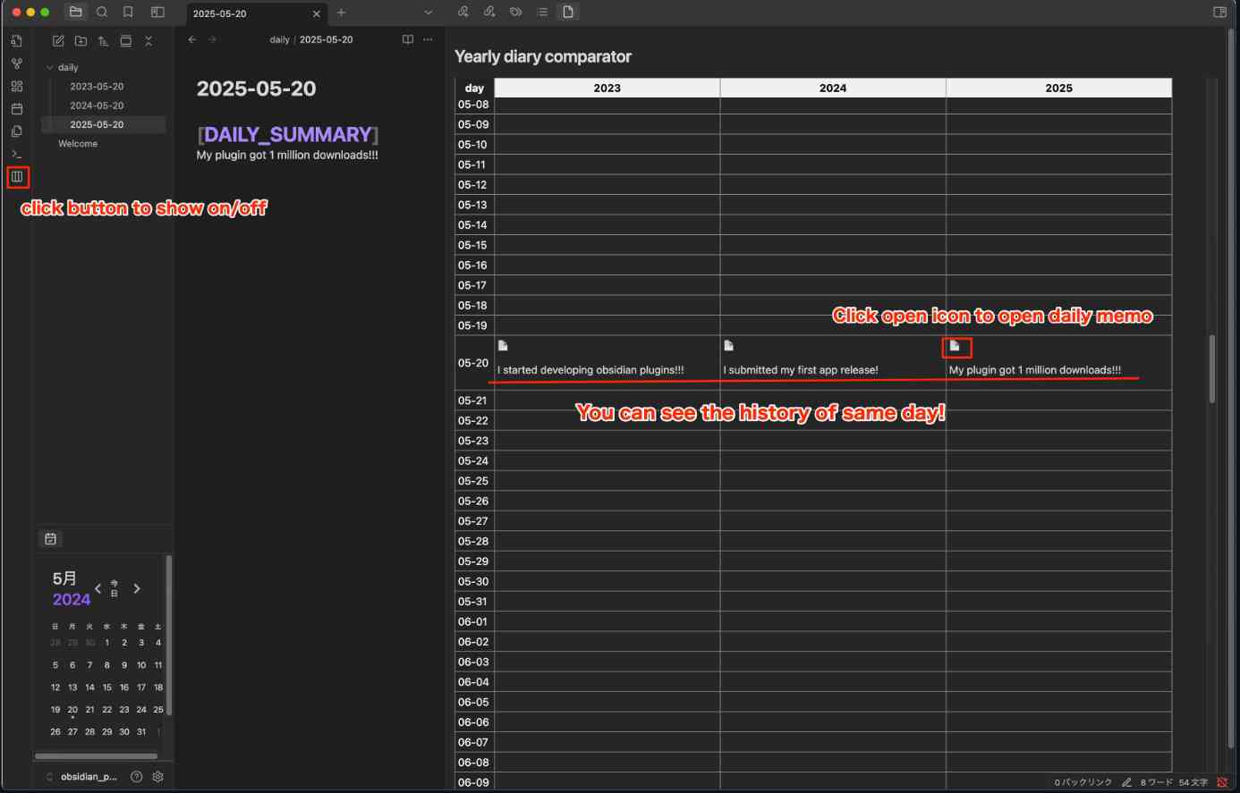ちなみにアプリのコードは以下にあります。まだリリースPRがマージされていないのでObsidianからのインストールはできません。 @[card](https://github.com/kiitosu/yearly-diary-comparator" >}}