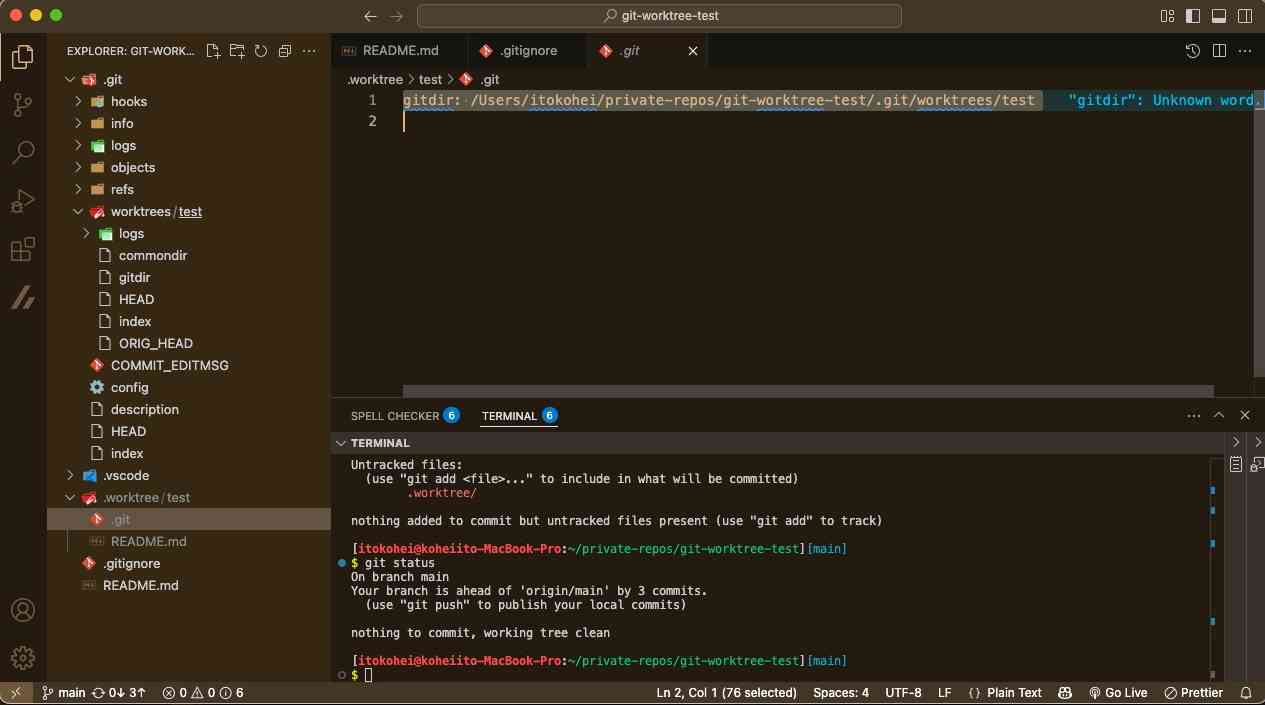 というファイルができているのでちょっと除いてみます。gitdir: /Users/itokohei/private-repos/git-worktree-test/.git/worktrees/test