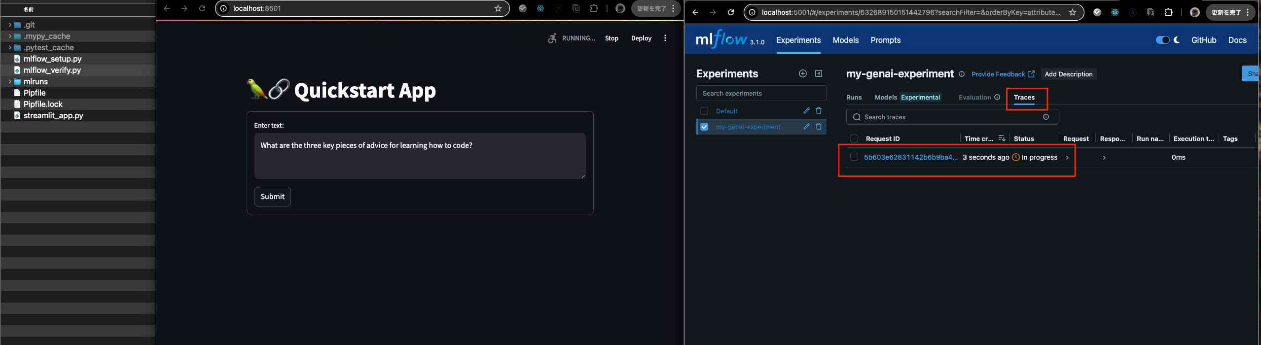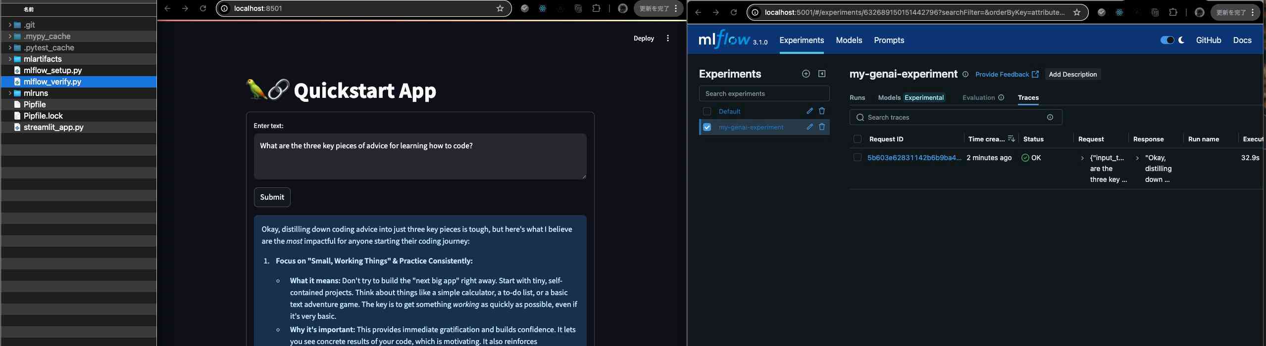 を作成します。import mlflow # Creates local mlruns directory for experiments mlflow.set_tracking_uri("http://localhost:5001") mlflow.set_experiment("my-genai-experiment")