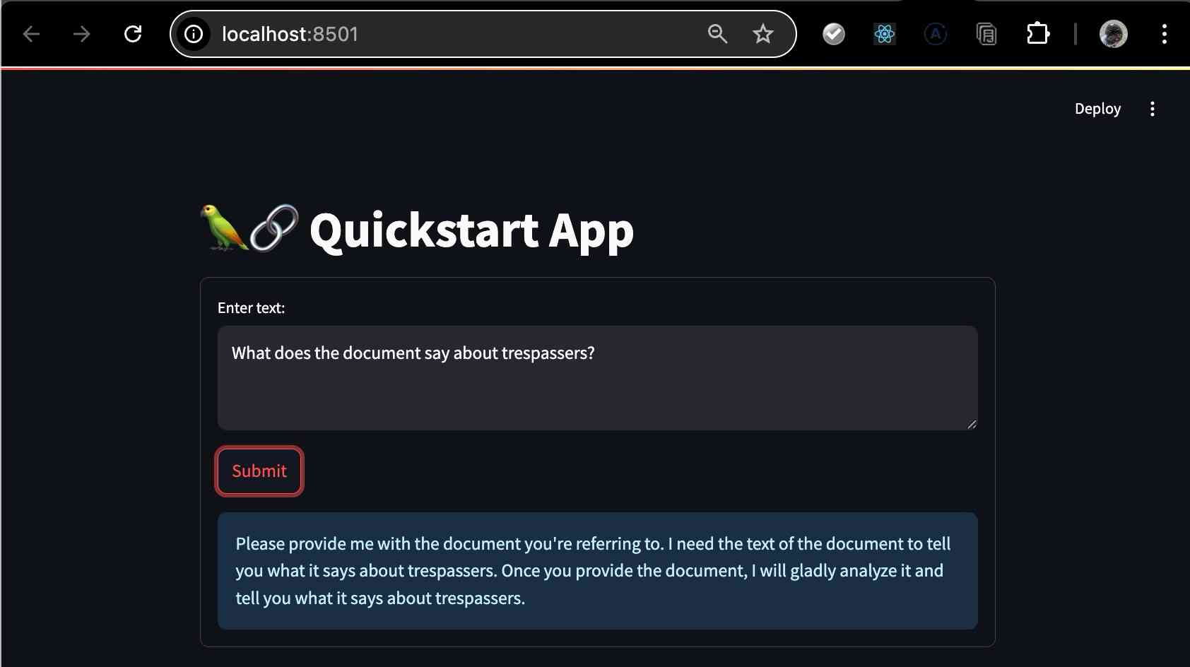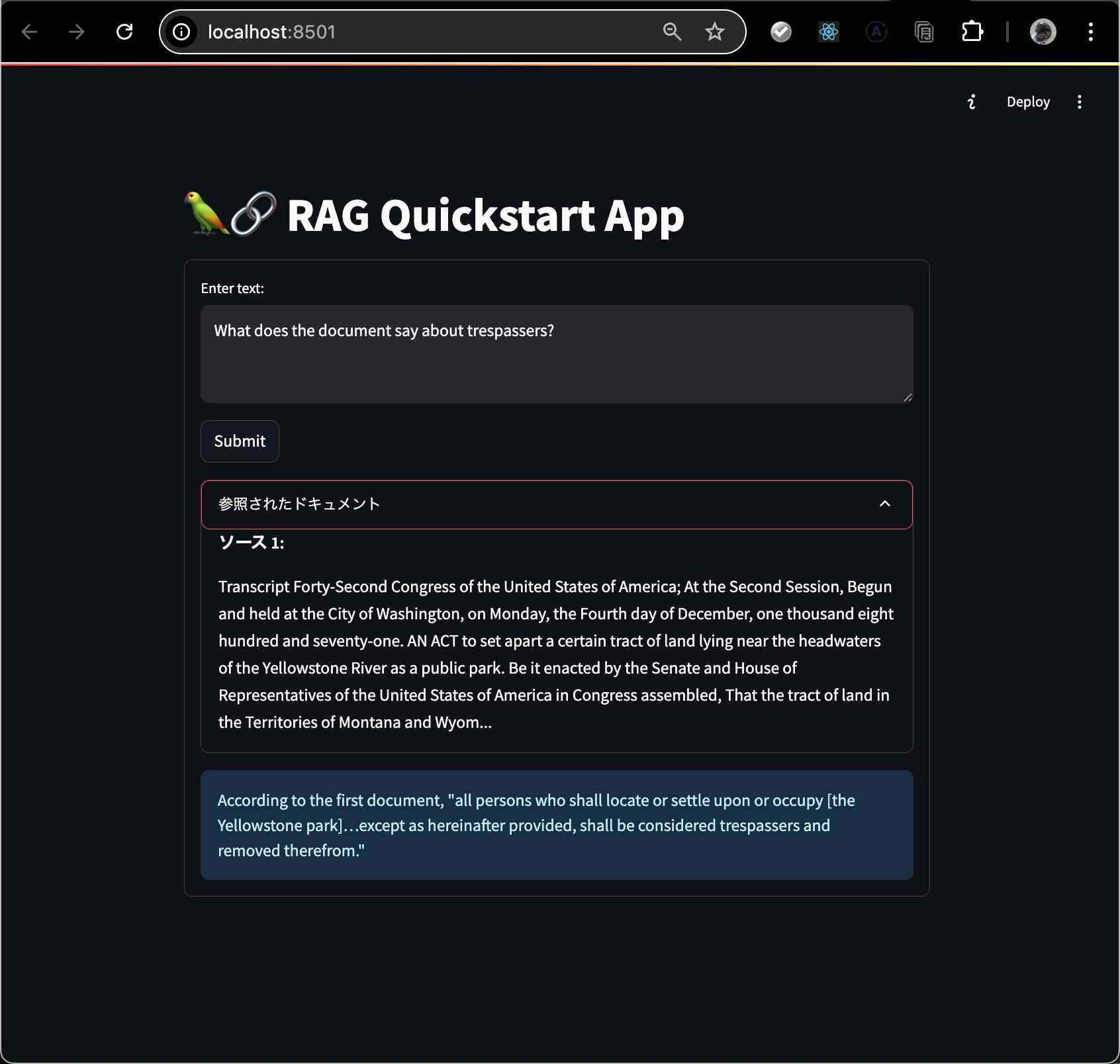Streamlitのアプリケーションが立上が得るので質問してみると、無事それっぽい返信が返ってきました!