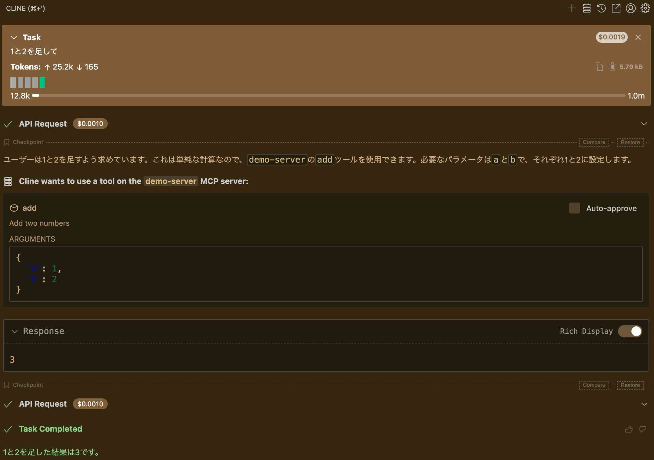 以下のようにClineからMCPサーバーを呼び出すことができました。