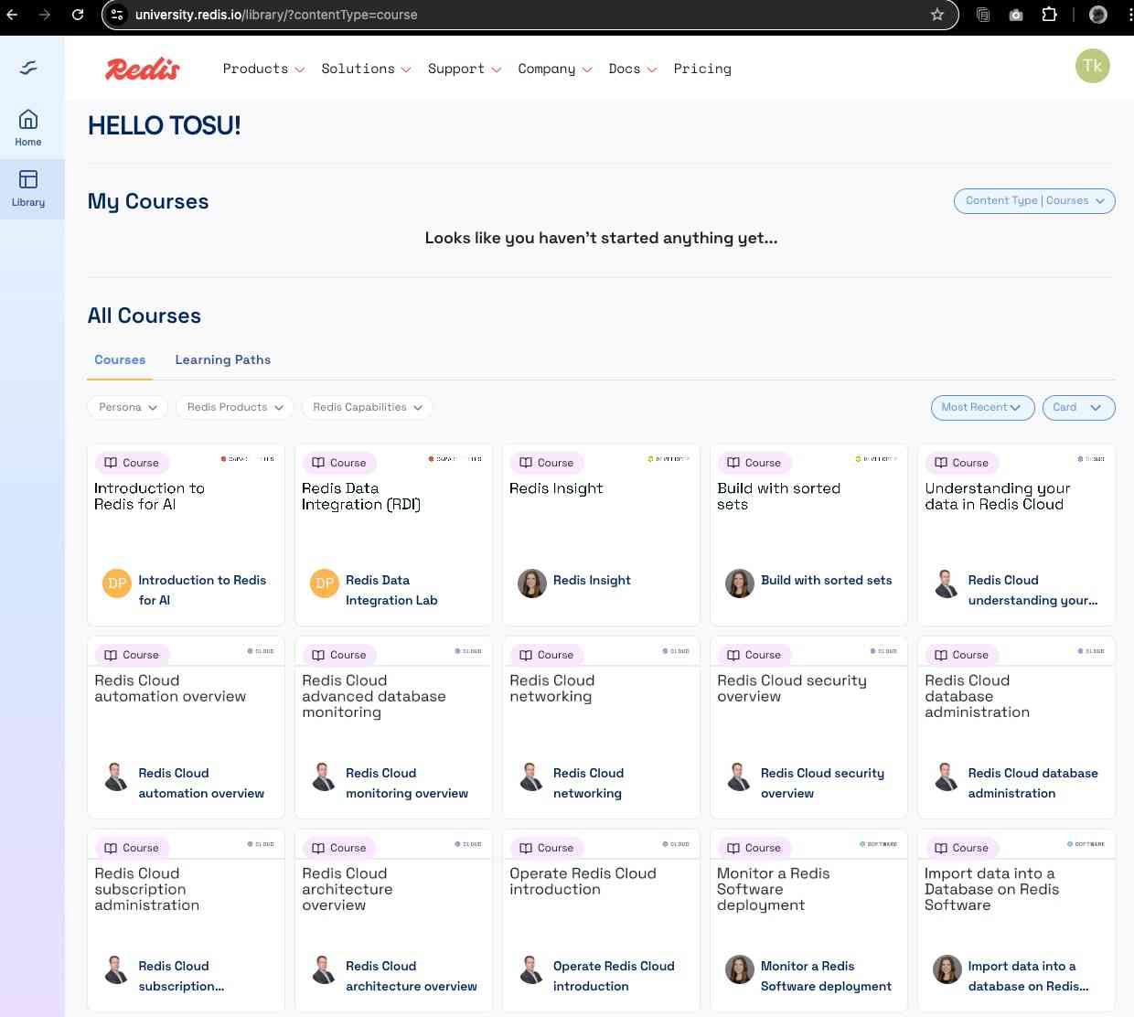 「Introduction to Redis for AI」とか気になりますね。ただ、今回は初回勉強ということで、「Get started with Redis」をやってみます。日本語字幕がないのがちょっときついですね。