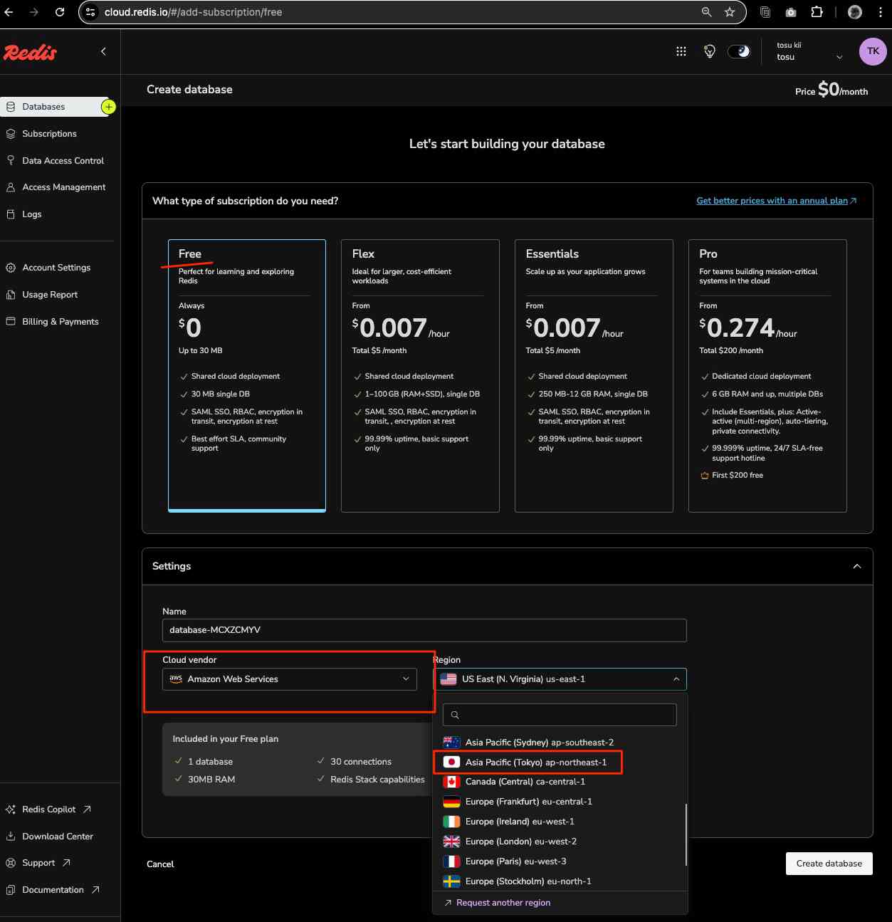 手っ取り早く試すには「Redisクラウド」の無料枠を使うのが良い。あるいは「Community Edition」をDockerから立ち上げるもの簡単で良い。今回はRedisクラウドを使ってみます。以下の2ステップで簡単に作成ができます。