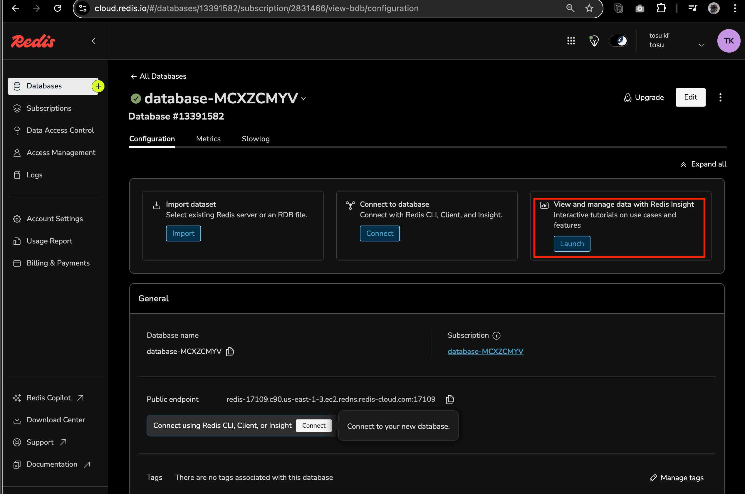 データベースの画面から「View and manage data with Redis Insight」の「Launch」をクリックします。