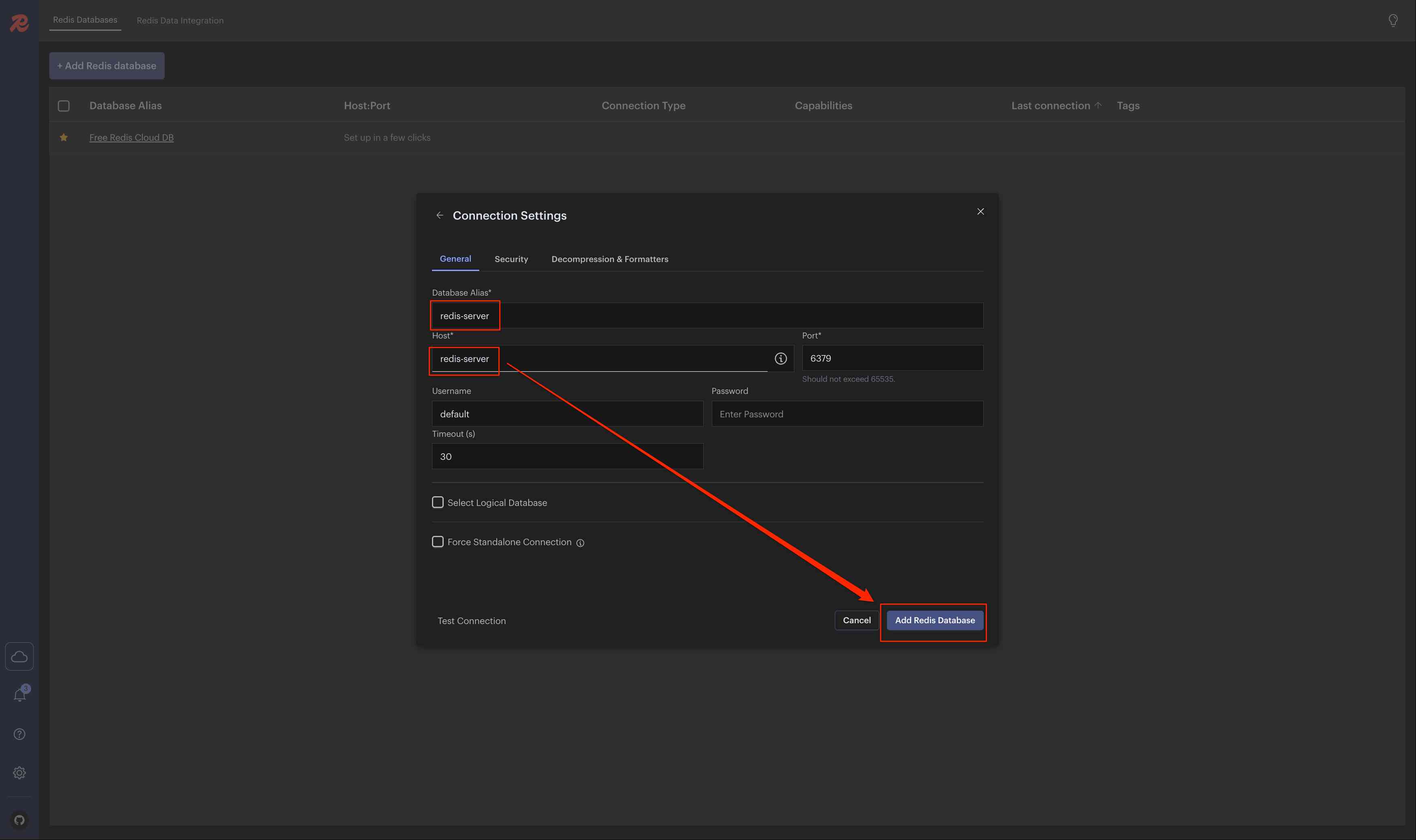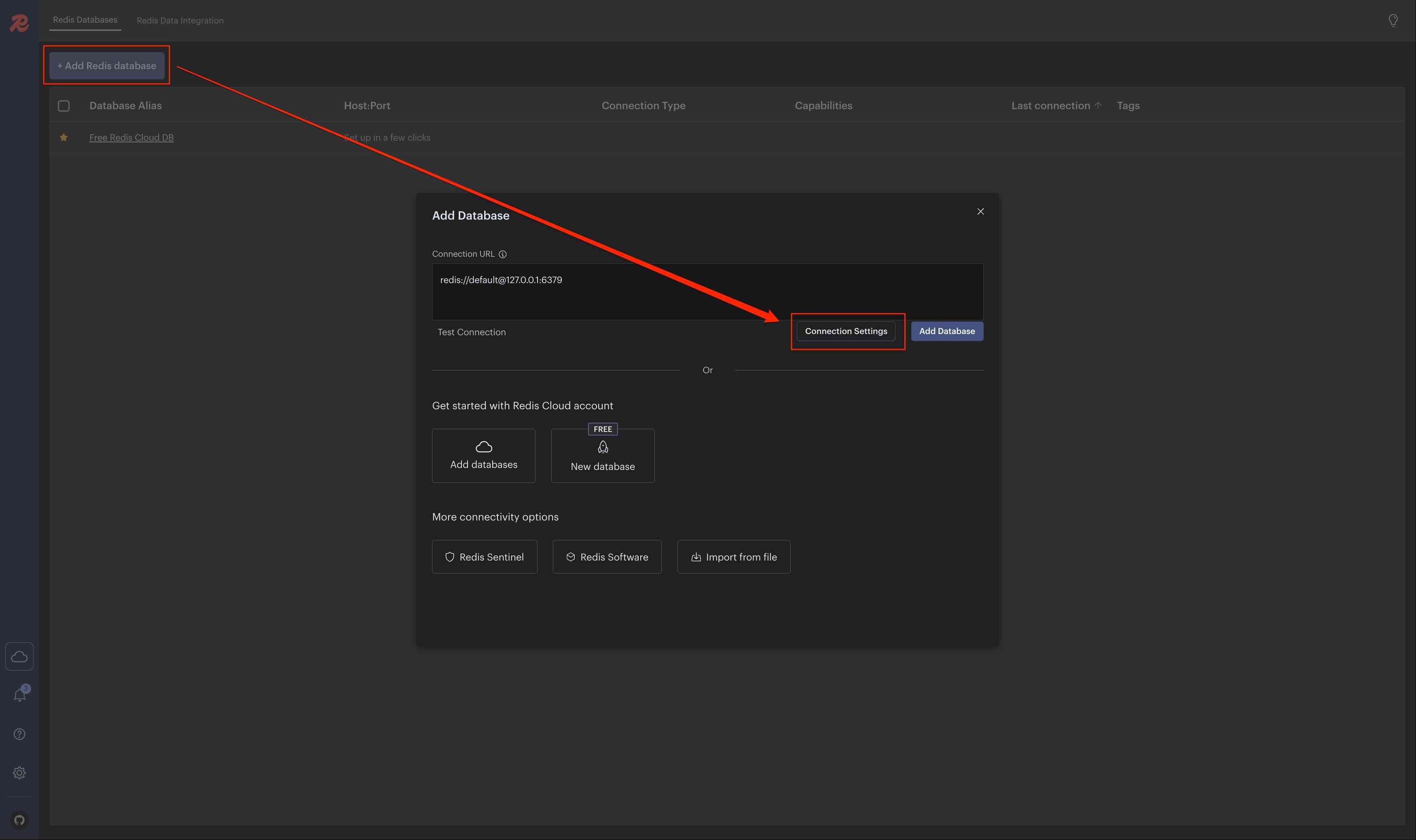を入力し、Add Redis database