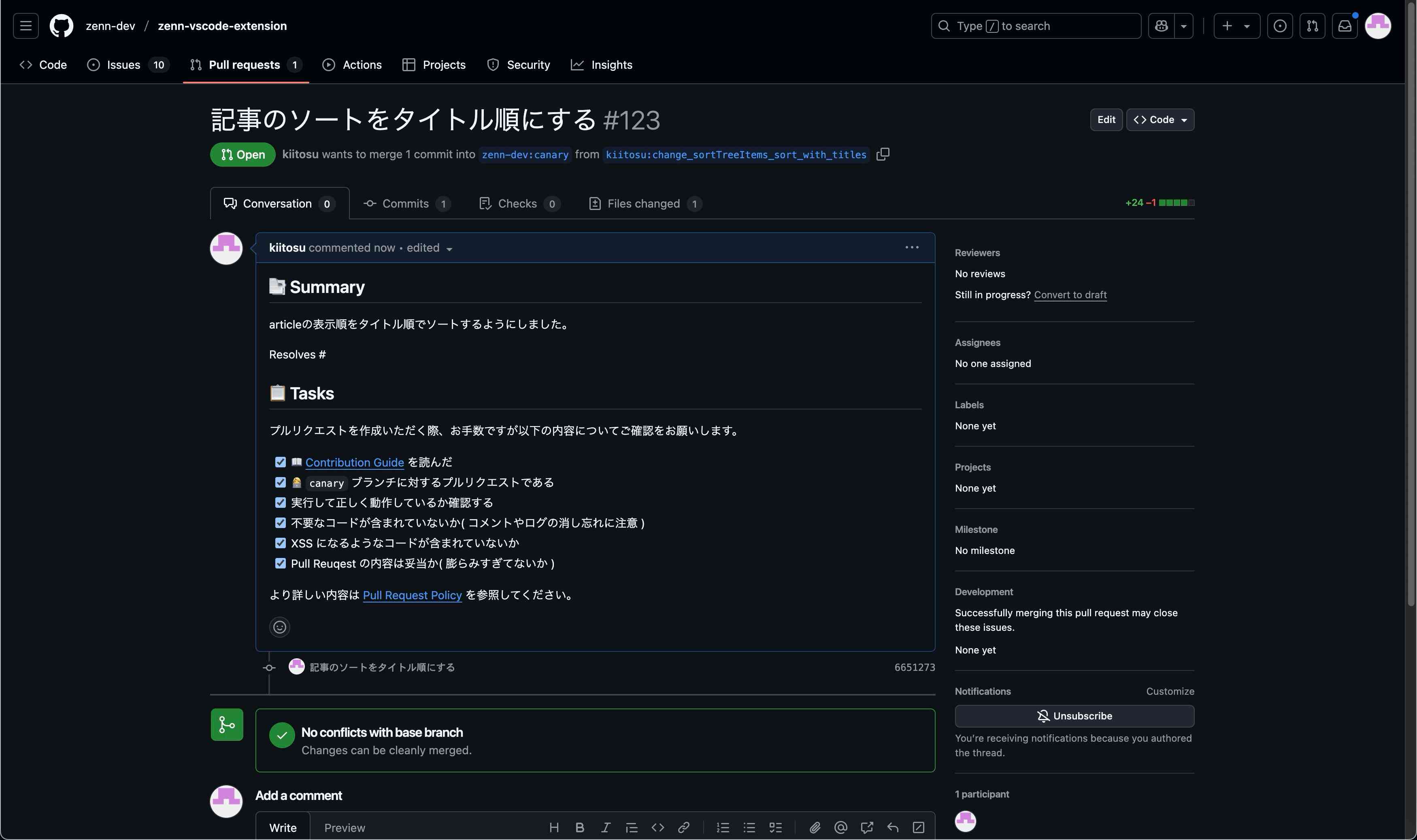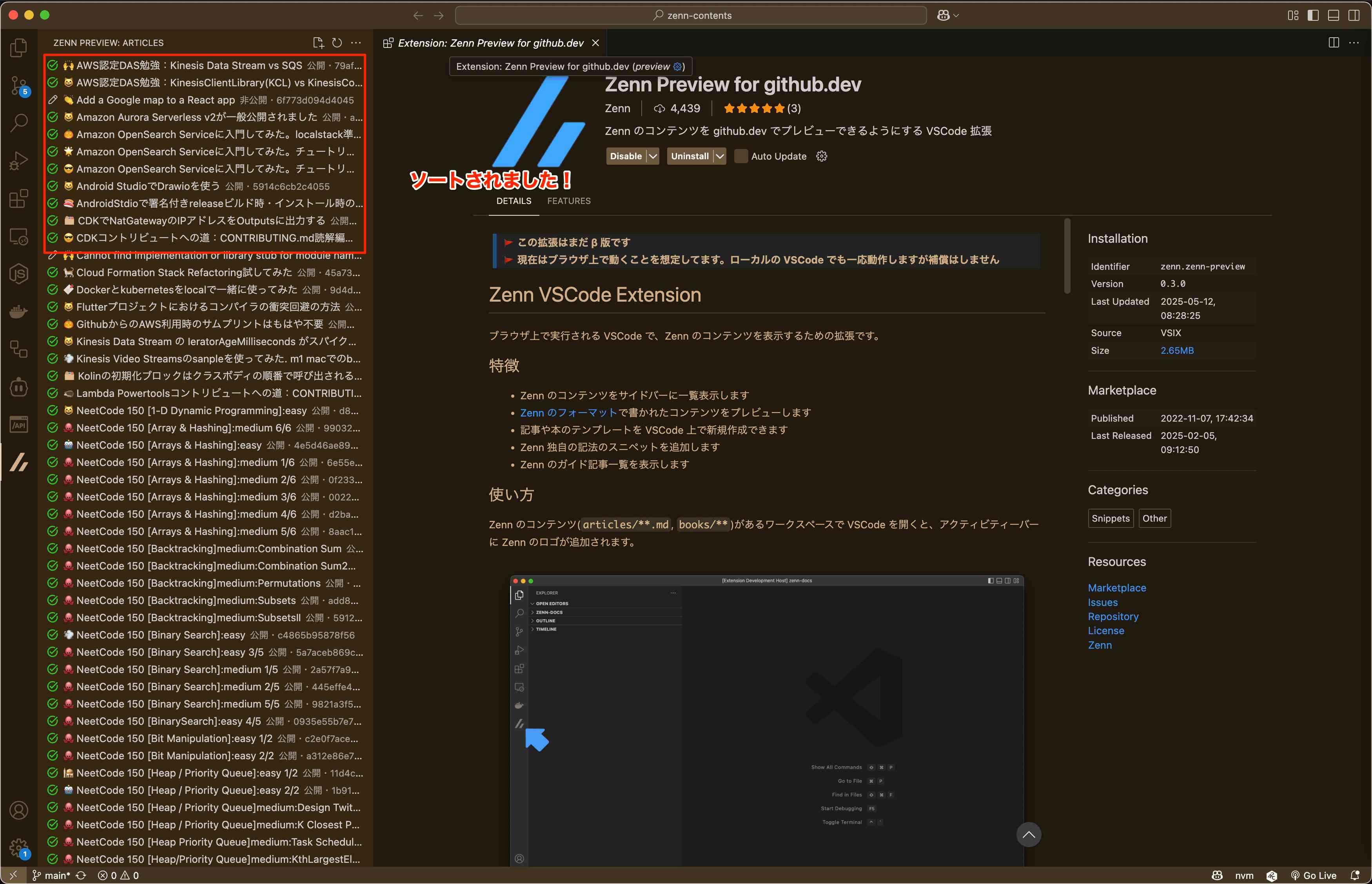 Zenn PreviewというVSCode拡張を使わせてもらっているが、記事一覧がソートされておらず、探すのが大変. 今回は記事一覧をソートする機能を追加してPRを出してみようと思う。